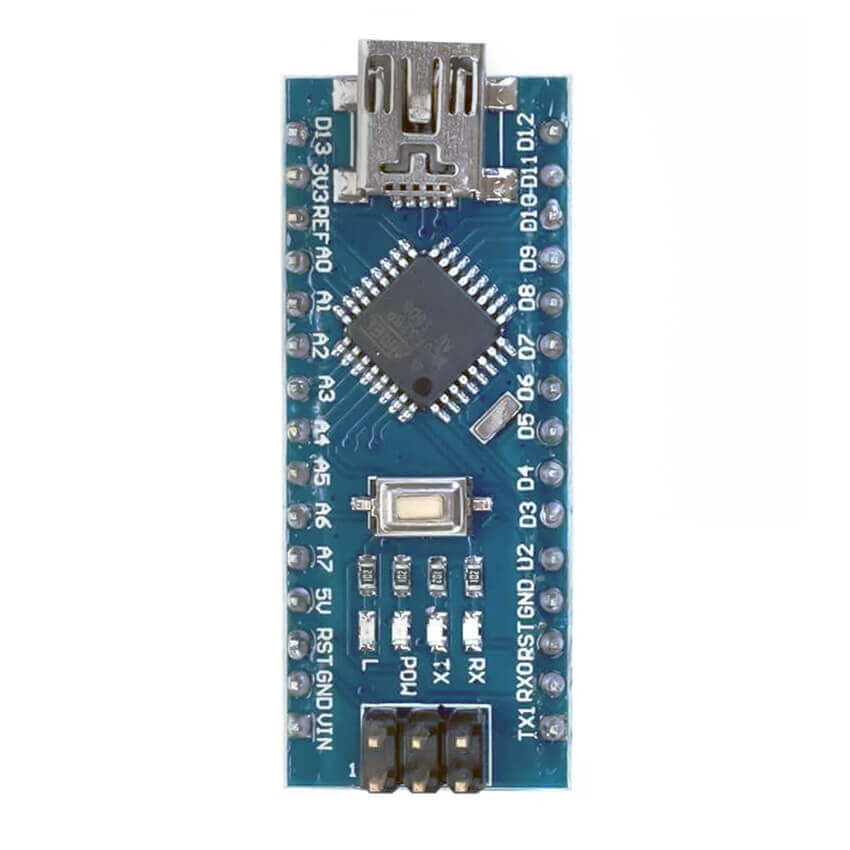 Arduino NANO – самый миниатюрный микроконтроллер семейства Ардуино. Плата работает на базе чипа ATmega328. Легко интегрируется в сложные схемы, обеспечивает высокие рабочие характеристики при минимальных габаритах. Размеры контроллера – 1.85 см x 4.2 см. Плата оснащена 14 цифровыми и 8 аналоговыми входами. Данные передаются по интерфейсам UART, I2C и SPI. Для синхронизации с компьютером предусмотрен разъем под кабель мини USB.